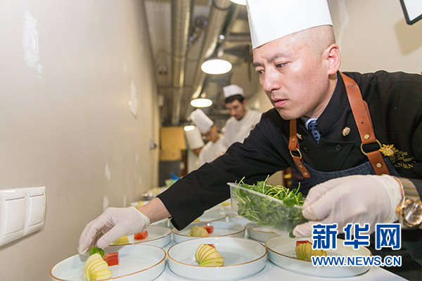 2月19日,在俄羅斯首都莫斯科,俄方廚師為菜品擺盤(pán)。新華社記者 白雪騏 攝