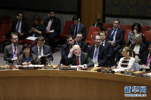 2月24日,在位于紐約的聯(lián)合國總部,俄羅斯常駐聯(lián)合國代表瓦西里·涅邊賈(前中)在安理會通過敘利亞全境?;饹Q議草案后發(fā)言。新華社記者 李木子 攝