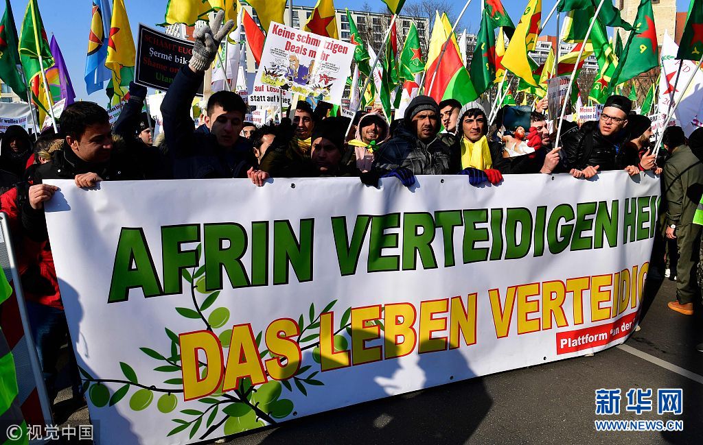當(dāng)?shù)貢r(shí)間2018年3月3日,德國柏林,當(dāng)?shù)孛癖娕e行游行,抗議土耳其對敘利亞阿夫林地區(qū)的庫爾德人采取軍事行動(dòng)。(圖片來源:視覺中國)