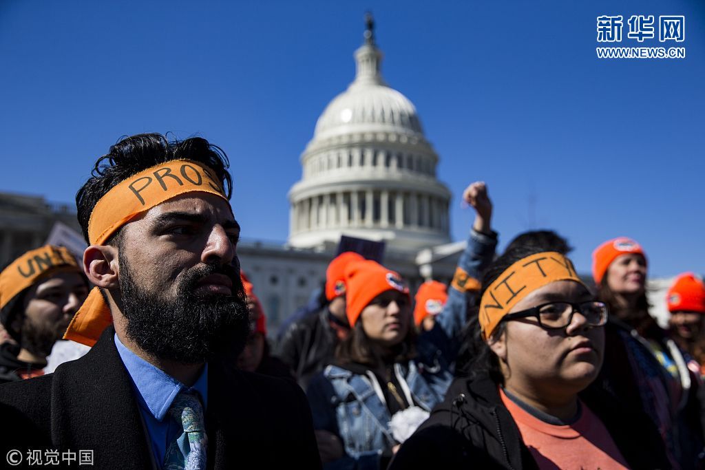 當(dāng)?shù)貢r間2018年3月5日,美國華盛頓,移民活動家在國會山舉行集會,抗議特朗普終結(jié)“夢想法案”計劃。(圖片來源:視覺中國)