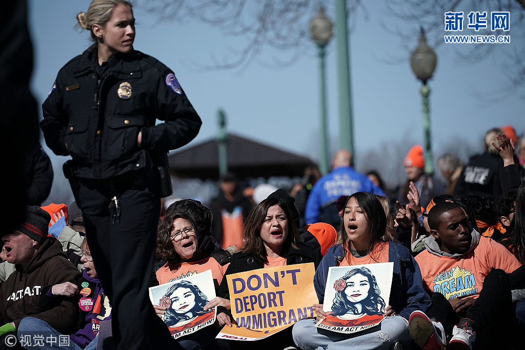 當(dāng)?shù)貢r(shí)間2018年3月5日,美國華盛頓,移民活動(dòng)家在國會(huì)山舉行集會(huì),抗議特朗普終結(jié)“夢想法案”計(jì)劃。(圖片來源:視覺中國)
