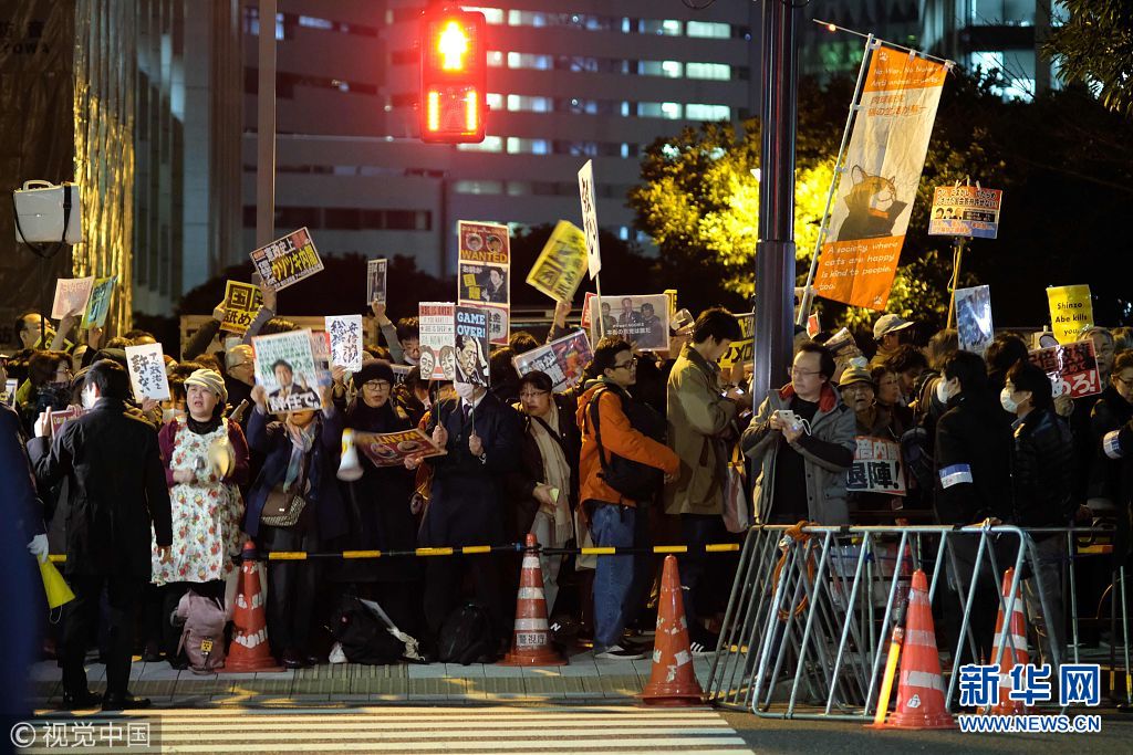 3月12日,日本東京,日本民眾在首相府邸前游行抗議。安倍晉三此前就森友學(xué)園丑聞事件的文件被篡改一事道歉。(圖片來源:視覺中國)