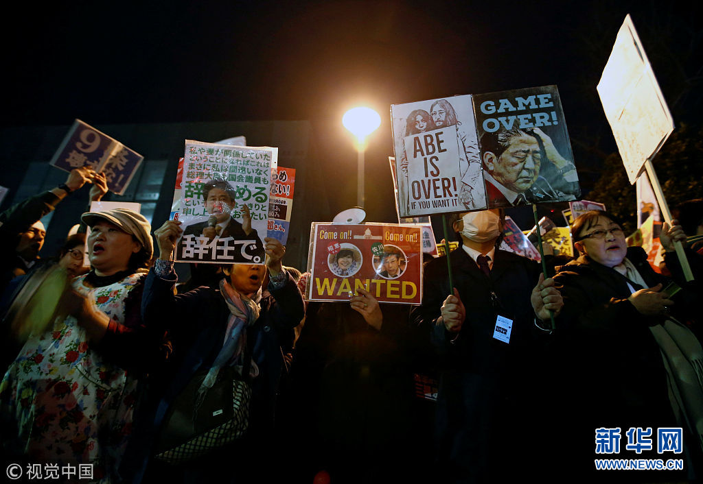 3月12日,日本東京,日本民眾在首相府邸前游行抗議。安倍晉三此前就森友學(xué)園丑聞事件的文件被篡改一事道歉。(圖片來源:視覺中國(guó))