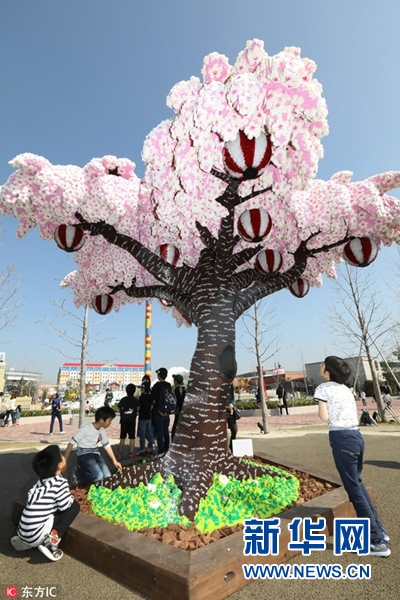 當?shù)貢r間2018年3月28日,日本名古屋,日本樂高樂園主題公園用樂高積木堆出一棵櫻花樹,被吉尼斯世界紀錄認證為世界最高的樂高櫻花樹。(圖片來源:東方IC)