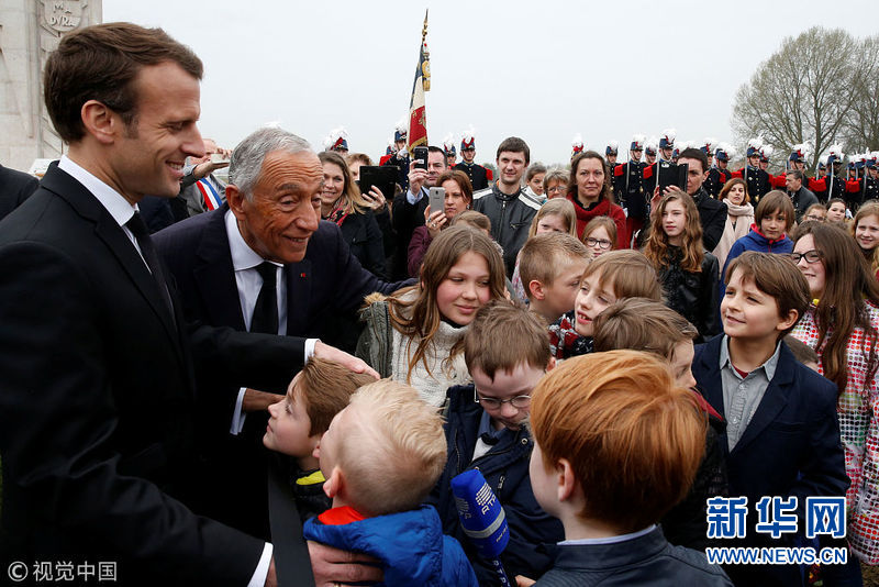 4月9日,法國里什堡,法國總統(tǒng)馬克龍和葡萄牙總統(tǒng)馬塞洛·雷貝洛·德索薩在一戰(zhàn)葡萄牙公墓出席一戰(zhàn)紀念儀式,紀念利斯戰(zhàn)役百年。(圖片來源:視覺中國)