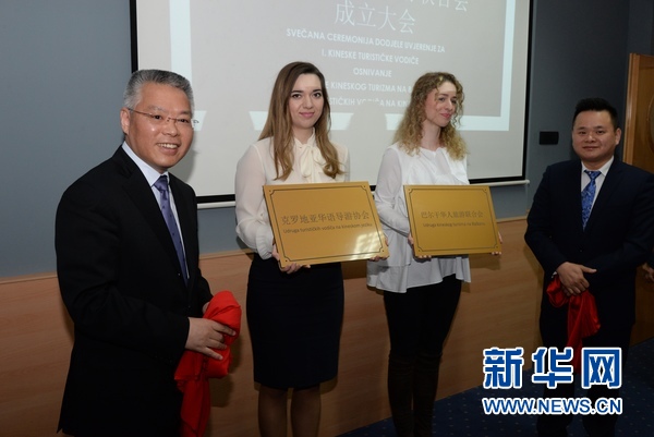 4月11日,中國(guó)駐克羅地亞大使胡兆明(左一)與克羅地亞華語導(dǎo)游協(xié)會(huì)會(huì)長(zhǎng)蔣曉亮(右一)在薩格勒布為當(dāng)天成立的克羅地亞華語導(dǎo)游協(xié)會(huì)和巴爾干華人旅游協(xié)會(huì)揭牌。新華社記者高磊 攝