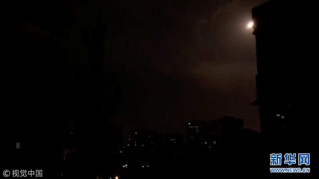 4月14日,敘利亞大馬士革,特朗普決定聯(lián)合英國和法國對敘利亞進(jìn)行精確打擊,大馬士革傳出爆炸聲,敘利亞方面進(jìn)行反擊。敘利亞阿拉伯?dāng)⒗麃喭ㄓ嵣?SANA)報道,敘政府軍在大馬士革以南地區(qū)擊落13枚導(dǎo)彈。敘利亞國家電視臺此前稱美英法三國對敘利亞“發(fā)動了侵略”。(圖片來源:視覺中國)