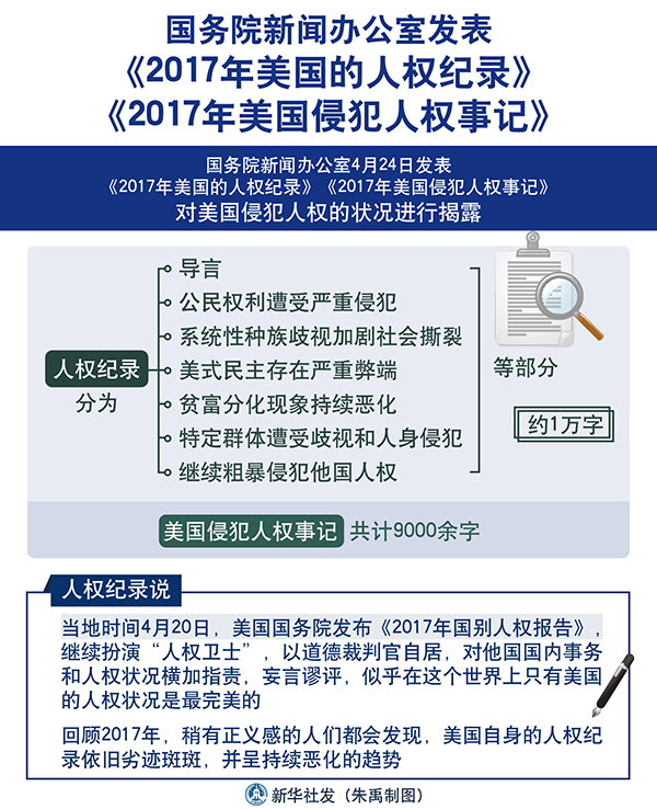 新華社北京4月24日電(記者黃小希、程卓)國務院新聞辦公室24日發(fā)表《2017年美國的人權紀錄》《2017年美國侵犯人權事記》,對美國侵犯人權的狀況進行揭露。