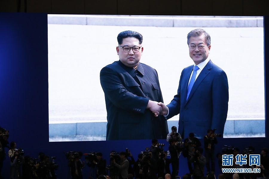這是4月27日在韓國高陽市媒體中心拍攝的朝鮮最高領(lǐng)導(dǎo)人金正恩(左)與韓國總統(tǒng)文在寅會晤的電視畫面。朝鮮最高領(lǐng)導(dǎo)人金正恩27日上午在板門店跨過軍事分界線,與韓國總統(tǒng)文在寅會晤。 新華社記者王婧嬙攝