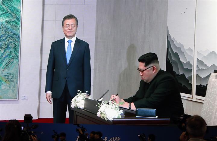 這是朝鮮最高領(lǐng)導(dǎo)人金正恩在板門店韓方一側(cè)的“和平之家”留言簿上題詞:新的歷史從現(xiàn)在開(kāi)始。(拍攝自電視畫(huà)面 攝影:李鵬)?