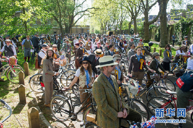 當(dāng)?shù)貢r(shí)間2018年5月5日,英國(guó)倫敦,當(dāng)?shù)嘏e辦復(fù)古騎行活動(dòng),民眾身穿花呢子服裝騎車穿行在倫敦街頭。今年是該活動(dòng)舉辦十周年。(圖片來源:東方IC)