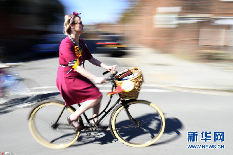 當(dāng)?shù)貢r(shí)間2018年5月5日,英國倫敦,當(dāng)?shù)嘏e辦復(fù)古騎行活動(dòng),民眾身穿花呢子服裝騎車穿行在倫敦街頭。今年是該活動(dòng)舉辦十周年。(圖片來源:東方IC)