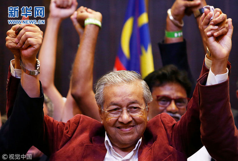 當(dāng)?shù)貢r(shí)間2018年5月9日,馬來西亞吉隆坡,馬哈蒂爾代表希望聯(lián)盟召開新聞發(fā)布會(huì)。9日,馬來西亞國會(huì)大選結(jié)束。10日凌晨官方點(diǎn)票結(jié)果顯示,前總理馬哈蒂爾(Mahathir)帶領(lǐng)的希望聯(lián)盟取得112席簡單多數(shù)國會(huì)議席,足以籌組政府及勝出大選,并終結(jié)執(zhí)政國民陣線長達(dá)60年的管治?,F(xiàn)總理納吉布領(lǐng)導(dǎo)的國民陣線僅獲得76席。(圖片來源:視覺中國)