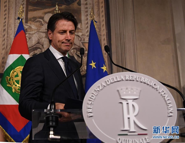 5月27日,在意大利首都羅馬,意新任總理孔特發(fā)表講話。據(jù)當(dāng)?shù)孛襟w報(bào)道,孔特27日晚間與總統(tǒng)馬塔雷拉會面并提交擬定的內(nèi)閣成員名單時(shí),馬塔雷拉否決了由意大利聯(lián)盟黨和五星運(yùn)動力推的持疑歐立場的經(jīng)濟(jì)學(xué)家保羅·薩沃納出任財(cái)政部長。孔特向總統(tǒng)提出放棄組閣任務(wù)請求,請求得到總統(tǒng)確認(rèn)。新華社發(fā)(阿爾貝托·林格里亞攝)