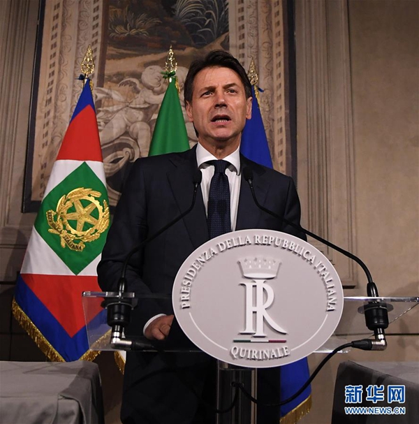 5月27日,在意大利首都羅馬,意新任總理孔特發(fā)表講話。據(jù)當?shù)孛襟w報道,孔特27日晚間與總統(tǒng)馬塔雷拉會面并提交擬定的內(nèi)閣成員名單時,馬塔雷拉否決了由意大利聯(lián)盟黨和五星運動力推的持疑歐立場的經(jīng)濟學家保羅·薩沃納出任財政部長??滋叵蚩偨y(tǒng)提出放棄組閣任務(wù)請求,請求得到總統(tǒng)確認。新華社發(fā)(阿爾貝托·林格里亞攝)