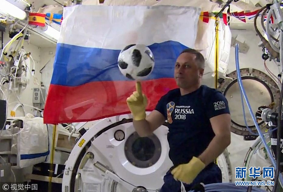 2018年5月31日,太空,俄羅斯宇航員Oleg Artemyev和自己的同事Anton Shkaplerov正在國(guó)際空間站內(nèi)玩足球,以此迎接俄羅斯世界杯的到來。(圖片來源:視覺中國(guó))