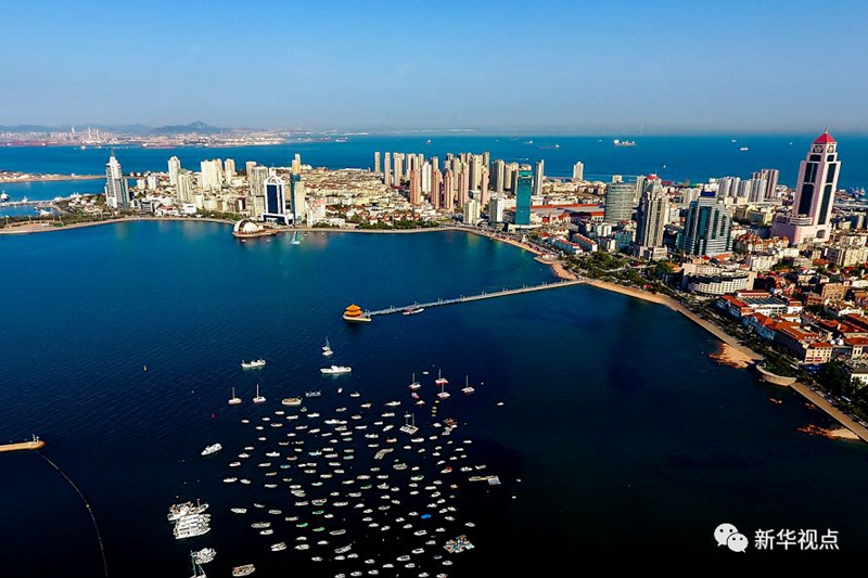 這是2018年5月4日無(wú)人機(jī)拍攝的棧橋和青島灣。新華社記者郭緒雷攝