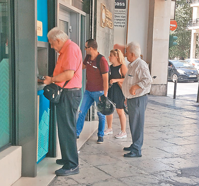 在希臘放松資本管制后,取款的希臘民眾增多。圖為雅典市民正在自動(dòng)取款機(jī)前排隊(duì)取款。記者 葉琦攝