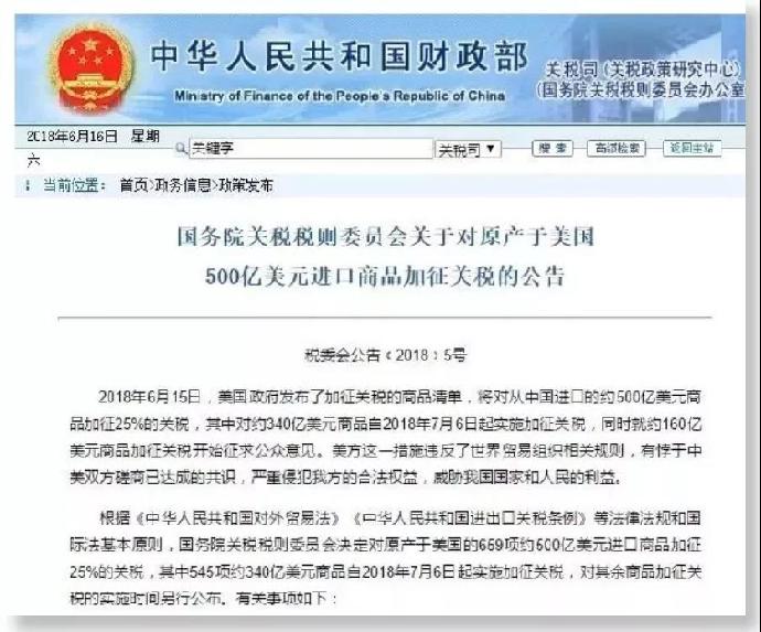今天凌晨(16日),中國國務院關稅稅則委員會發(fā)布公告決定,對原產于美國的659項約500億美元進口商品加征25%的關稅。委員會辦公室有關負責人還表示,中方注意到,美方發(fā)表聲明稱,如果中國采取報復性措施,美國將繼續(xù)追加額外關稅。對此,中國將保留采取相應措施的權利。