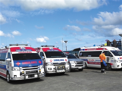 目前,普吉島查龍碼頭是搜救展開作業(yè)的地方,設有營救指揮部,內(nèi)部配有醫(yī)護人員、旅游警察以及軍方人員,外面還有5輛救護車待命。當天普吉島天氣晴好,站在碼頭可看到大皇帝島,乘快艇二十分鐘便可抵達事發(fā)地附近。