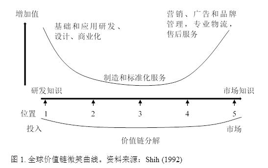全球價值鏈構建了一個跨國或者跨地區(qū)不同公司實現(xiàn)不同的工序和商業(yè)功能的生產(chǎn)架構(Grossman和Rossi-Hansberg,2012)。這個架構是“生產(chǎn)性的(價值增長的)通向并且支持最終使用的順序” (Sturgeon 2001)。微笑曲線提出了一種不同的解構國際貿(mào)易的方法。有些國家專業(yè)化“生產(chǎn)”知識與研發(fā),而另一些國家專業(yè)化于制造業(yè),或者品牌營銷。因此,一個產(chǎn)品的增加值不再是完全屬于某一個國家,而是整條價值鏈上的參與者都可以分一杯羹。在為最終產(chǎn)品貢獻價值的生產(chǎn)工序的鏈條上(既,產(chǎn)品的價值鏈),一般的工序鏈條開始于基礎和應用研究與設計。這些研究與設計活動往往會帶來新的想法、技術、新產(chǎn)品設計和新的生產(chǎn)工藝。這個工序鏈條下一環(huán)節(jié)是商業(yè)化這些研究成果,如專利和知識產(chǎn)權(想法、論文、知識等);再下一環(huán)節(jié)是資源的獲取和材料的生產(chǎn)(包括農(nóng)業(yè)產(chǎn)品),零部件的生產(chǎn)和產(chǎn)品的組裝,以及最后環(huán)節(jié)的營銷、廣告、品牌管理、物流、商業(yè)服務和售后服務。另外,價值鏈在文獻中的定義是超出中間品貿(mào)易的,它強調(diào)在不同環(huán)節(jié)上領先企業(yè)與供應商之間的權力架構 (Milberg,2004)。
