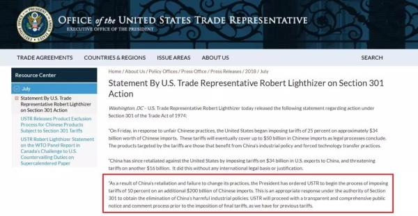 第二,強(qiáng)調(diào)中國不聽勸,未按其要求“限期整改”——聲明稱,過去一年,特朗普政府“耐心”敦促中國停止原有做法、開放市場、參與真正的市場競爭,并給出了“清晰和詳細(xì)”的具體改變要求,但中國“并未改變令美國經(jīng)濟(jì)未來處于風(fēng)險(xiǎn)的行為”,反而開始報(bào)復(fù)美國產(chǎn)品,這樣做“缺乏任何國際法理基礎(chǔ)或理由”。所以他們覺得,原有的力度不夠了,要再加加碼,“這是美國在301條款授權(quán)下對消除中國‘有害’產(chǎn)業(yè)政策做出的合適回應(yīng)”。(就奇怪怎么這個(gè)301條款哪兒哪兒都好使?)