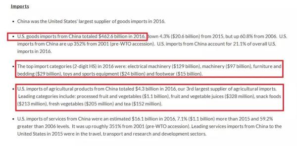 首先,從中方向美方的出口結(jié)構(gòu)來看:2016年美國從中國進(jìn)口總值4626億美元,是美國最大的商品供給方。進(jìn)口額最高的是電子機(jī)械類產(chǎn)品(1290億美元),機(jī)器(970億美元),家具及寢具(290億美元),玩具及運(yùn)動(dòng)裝備(240億美元),鞋類(150億美元)。此外,從中國進(jìn)口的農(nóng)產(chǎn)品總額43億美元(這已經(jīng)是美國第三大農(nóng)產(chǎn)品供應(yīng)方了),其中占比最高的是加工后的水果及蔬菜(11億美元),水果及蔬菜汁(3.28億美元),快餐休閑類食品(2.13億美元),新鮮蔬菜(2.05億美元)及茶葉(1.52億美元)。