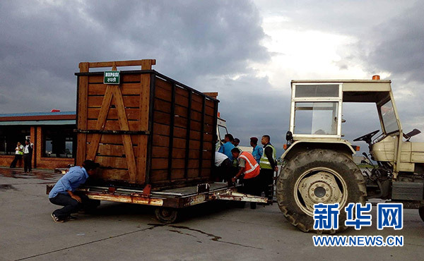 7月12日,在尼泊爾首都加德滿都特里布萬國際機(jī)場,工作人員在運(yùn)送裝有犀牛的木箱。新華社發(fā)
