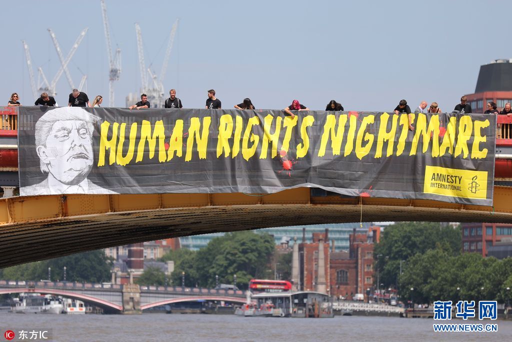 7月12日,英國倫敦,國際特赦組織成員在倫敦泰晤士河上沃克斯豪爾橋懸掛橫幅,抗議美國總統(tǒng)特朗普到訪英國。(圖片來源:東方IC)