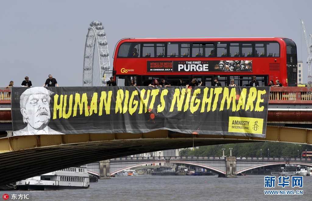 7月12日,英國倫敦,國際特赦組織成員在倫敦泰晤士河上沃克斯豪爾橋懸掛橫幅,抗議美國總統(tǒng)特朗普到訪英國。(圖片來源:東方IC)