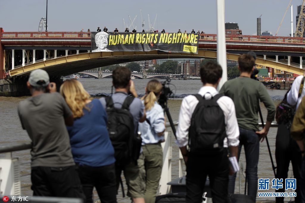 7月12日,英國倫敦,國際特赦組織成員在倫敦泰晤士河上沃克斯豪爾橋懸掛橫幅,抗議美國總統(tǒng)特朗普到訪英國。(圖片來源:東方IC)