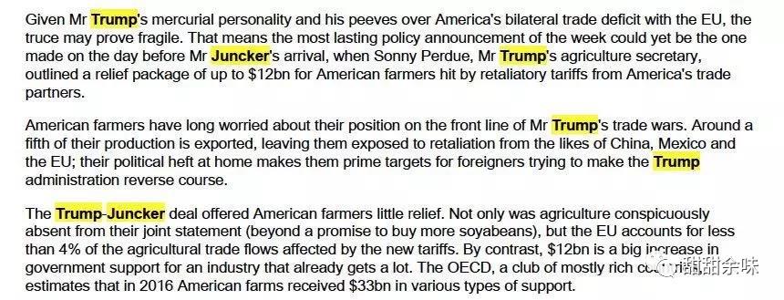 2.從英國媒體的報(bào)道切入點(diǎn)來看,英國作為歐洲國家的重要代表(雖然英國已經(jīng)發(fā)布了脫歐白皮書,但是在歐盟的官網(wǎng)上,歐盟的28個(gè)國家里,目前仍然是包括了United Kingdom的),對美國對外咋咋呼呼給各國添亂、實(shí)際上不動(dòng)聲色自有打算的做法并不感冒。管中窺豹,或可判斷容克代表歐盟剛剛表過的態(tài)的不確定性將進(jìn)一步上升,除了德國、法國之外,英國也不可能真的跟美國好到一個(gè)鼻孔出氣。更不要說在歐盟內(nèi)部農(nóng)業(yè)出口占大頭的其他國家。
