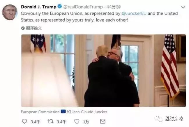 畢竟,到訪美國的歐盟委員會(huì)主席容克,不僅得到了美國媒體濃墨重彩的報(bào)道,更在特朗普的推特上,將白宮玫瑰園的浪漫延續(xù)了下去——《經(jīng)濟(jì)學(xué)人》給這次見面取了個(gè)唯美貼切的標(biāo)題:Sealed with a kiss(以吻封緘)。(哈哈哈,莫名覺得這首歐美經(jīng)典情歌用在這里居然有說不出的貼切,《經(jīng)濟(jì)學(xué)人》取標(biāo)題的能力也真是要給個(gè)大寫的服字?。?/p>