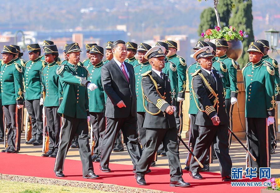 7月24日,國(guó)家主席習(xí)近平在比勒陀利亞同南非總統(tǒng)拉馬福薩舉行會(huì)談。會(huì)談前,拉馬福薩為習(xí)近平舉行隆重歡迎儀式。 新華社記者 謝環(huán)馳 攝