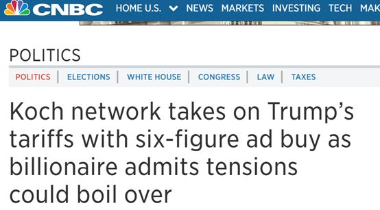 可隨著之后特朗普對中國等國發(fā)動貿(mào)易戰(zhàn)的行為,以及相關惡果的逐漸顯現(xiàn),科赫家族的最新表態(tài)也與今年1月的言論形成了鮮明的對比。