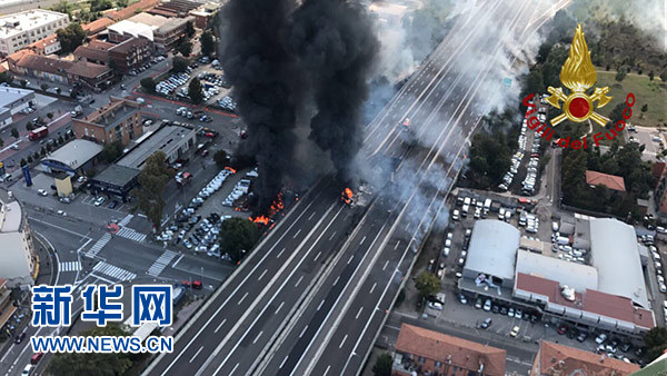 這張8月6日意大利消防部門發(fā)布在社交媒體推特上的照片顯示的是博洛尼亞油罐車爆炸事件現(xiàn)場(chǎng)。 新華社發(fā)