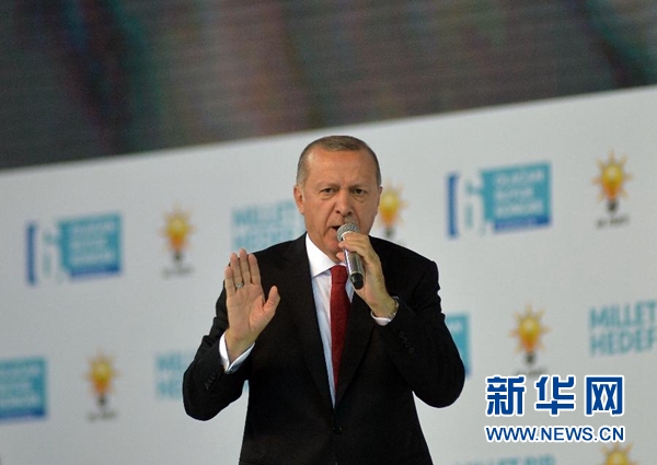 8月18日,在土耳其首都安卡拉,土耳其總統(tǒng)埃爾多安在執(zhí)政黨正義與發(fā)展黨年度大會上發(fā)表演講。 土耳其總統(tǒng)埃爾多安18日表示,土耳其不會向經濟威脅屈服。 新華社發(fā)(穆斯塔法·卡亞攝)