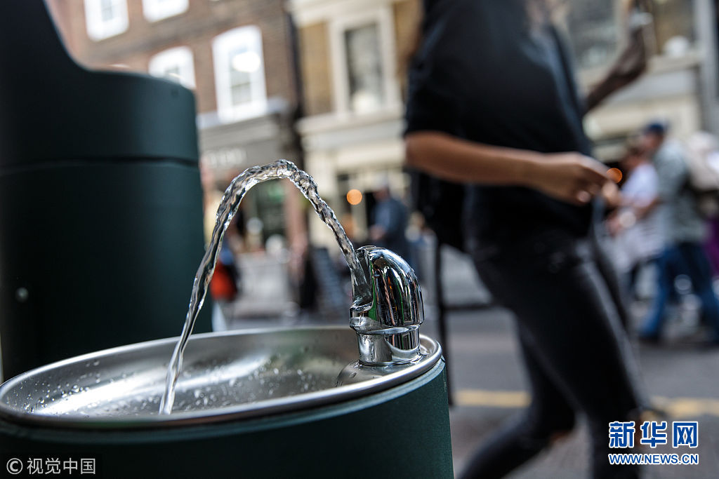 當(dāng)?shù)貢r(shí)間2018年8月28日,英國(guó)倫敦,民眾在公共飲水機(jī)旁飲水。倫敦市長(zhǎng)近日引進(jìn)了20個(gè)新的公共飲水機(jī),鼓勵(lì)人們自帶杯子取水喝,從而減少塑料垃圾。 (圖片來(lái)源:視覺中國(guó))