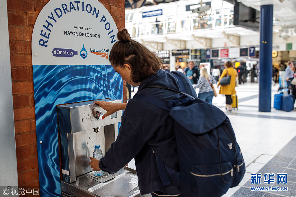 當(dāng)?shù)貢r間2018年8月28日,英國倫敦,民眾在公共飲水機旁飲水。倫敦市長近日引進了20個新的公共飲水機,鼓勵人們自帶杯子取水喝,從而減少塑料垃圾。 (圖片來源:視覺中國)
