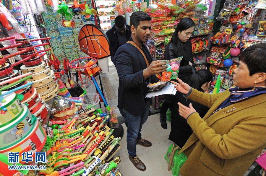 浙江義烏國際商貿(mào)城小商品經(jīng)營戶(右一)和一名非洲客商談生意(2017年1月5日攝)。 新華社記者 譚進 攝