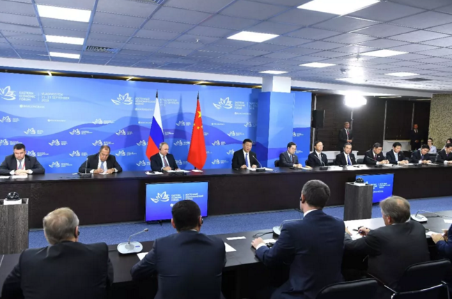 9月11日,國(guó)家主席習(xí)近平在符拉迪沃斯托克和俄羅斯總統(tǒng)普京共同出席中俄地方領(lǐng)導(dǎo)人對(duì)話(huà)會(huì)。 新華社記者 饒愛(ài)民攝