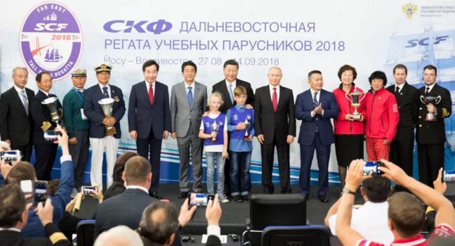 9月12日,第四屆東方經(jīng)濟(jì)論壇全會(huì)在符拉迪沃斯托克舉行。中國(guó)國(guó)家主席習(xí)近平、俄羅斯總統(tǒng)普京、蒙古國(guó)總統(tǒng)巴特圖勒嘎、日本首相安倍晉三、韓國(guó)總理李洛淵等出席。這是全會(huì)后,與會(huì)各國(guó)領(lǐng)導(dǎo)人共同出席第三屆“遠(yuǎn)東杯”國(guó)際帆船拉力賽第一賽段頒獎(jiǎng)儀式。新華社記者 黃敬文 攝