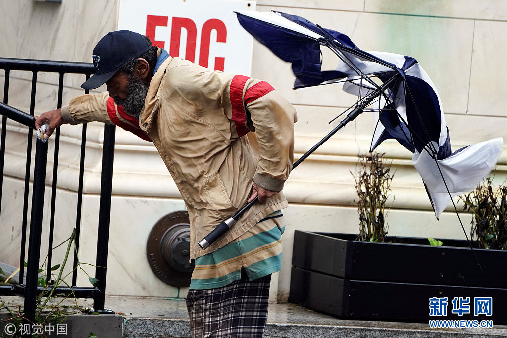 當(dāng)?shù)貢r(shí)間2018年9月15日,美國(guó)北卡羅來(lái)納州,颶風(fēng)“佛羅倫薩”在美國(guó)北卡羅來(lái)納州登陸,一名當(dāng)?shù)啬凶泳o握欄桿抵御狂風(fēng)。(圖片來(lái)源:視覺中國(guó))