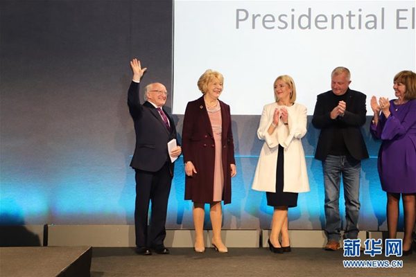 10月27日,在愛爾蘭首都都柏林,希金斯(左一)在總統(tǒng)選舉獲勝后向支持者致意。愛爾蘭總統(tǒng)選舉機構(gòu)負責人27日晚宣布,愛爾蘭現(xiàn)任總統(tǒng)希金斯在26日舉行的選舉中獲勝,再次當選總統(tǒng)。新華社發(fā)