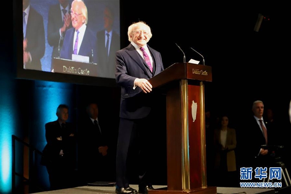 10月27日,在愛爾蘭首都都柏林,希金斯(中)在總統(tǒng)選舉獲勝后發(fā)表講話。愛爾蘭總統(tǒng)選舉機構(gòu)負責人27日晚宣布,愛爾蘭現(xiàn)任總統(tǒng)希金斯在26日舉行的選舉中獲勝,再次當選總統(tǒng)。新華社發(fā)