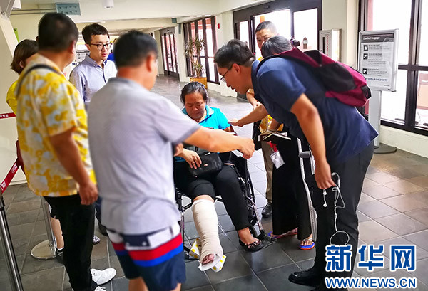 在機(jī)場(chǎng)等候的中國(guó)乘客秩序井然,許多人舉著國(guó)旗合影,非常興奮。一位在塞班開店的王女士腳部骨折,因當(dāng)?shù)蒯t(yī)療條件有限,她向領(lǐng)館尋求幫助,經(jīng)領(lǐng)館協(xié)調(diào),也順利搭上川航飛機(jī)回國(guó)。