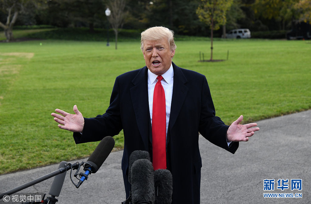 當?shù)貢r間2018年10月31日,美國華盛頓,美國總統(tǒng)特朗普啟程前往佛羅里達州出席競選集會,在白宮南草坪發(fā)表講話。特朗普稱,計劃部署在美墨邊境的現(xiàn)役軍人數(shù)量或增加至15000人,以嚴防來勢洶洶的“大篷車”移民。(圖片來源:視覺中國)