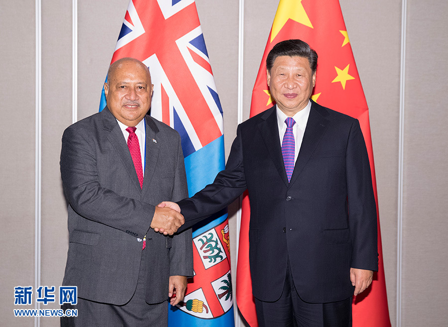 11月16日,國(guó)家主席習(xí)近平在莫爾茲比港會(huì)見(jiàn)斐濟(jì)政府代表、國(guó)防部長(zhǎng)昆布安博拉。 新華社記者 黃敬文 攝