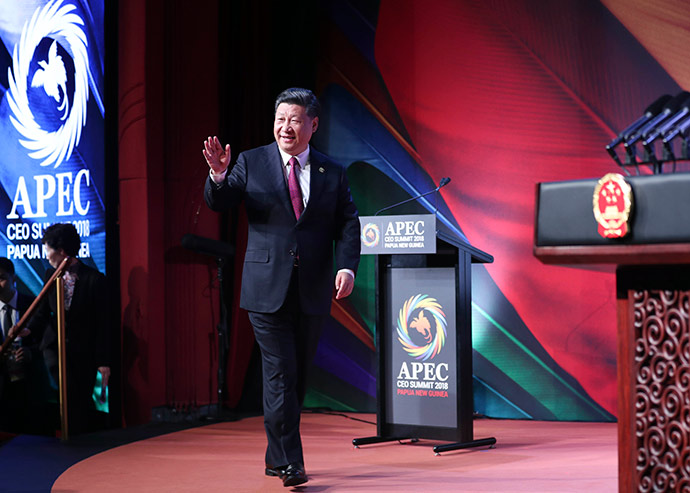 11月17日,國(guó)家主席習(xí)近平應(yīng)邀出席在巴布亞新幾內(nèi)亞莫爾茲比港舉行的亞太經(jīng)合組織工商領(lǐng)導(dǎo)人峰會(huì)并發(fā)表題為《同舟共濟(jì)創(chuàng)造美好未來》的主旨演講。新華社記者 鞠鵬 攝