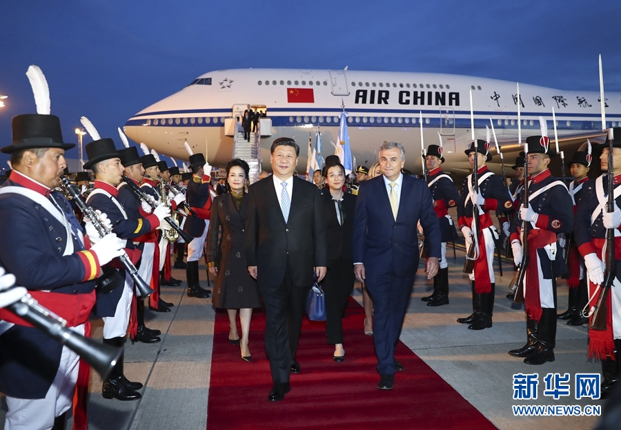 當?shù)貢r間20時05分許,習近平乘坐的專機抵達布宜諾斯艾利斯埃塞伊薩國際機場。習近平和夫人彭麗媛受到阿根廷外交部長福列、胡胡伊省省長莫拉萊斯等熱情迎接。儀仗隊長趨前致敬,軍樂團奏響雄勁有力的進行曲,習近平和彭麗媛沿紅地毯前行,禮兵分列紅地毯兩側(cè),行注目禮。